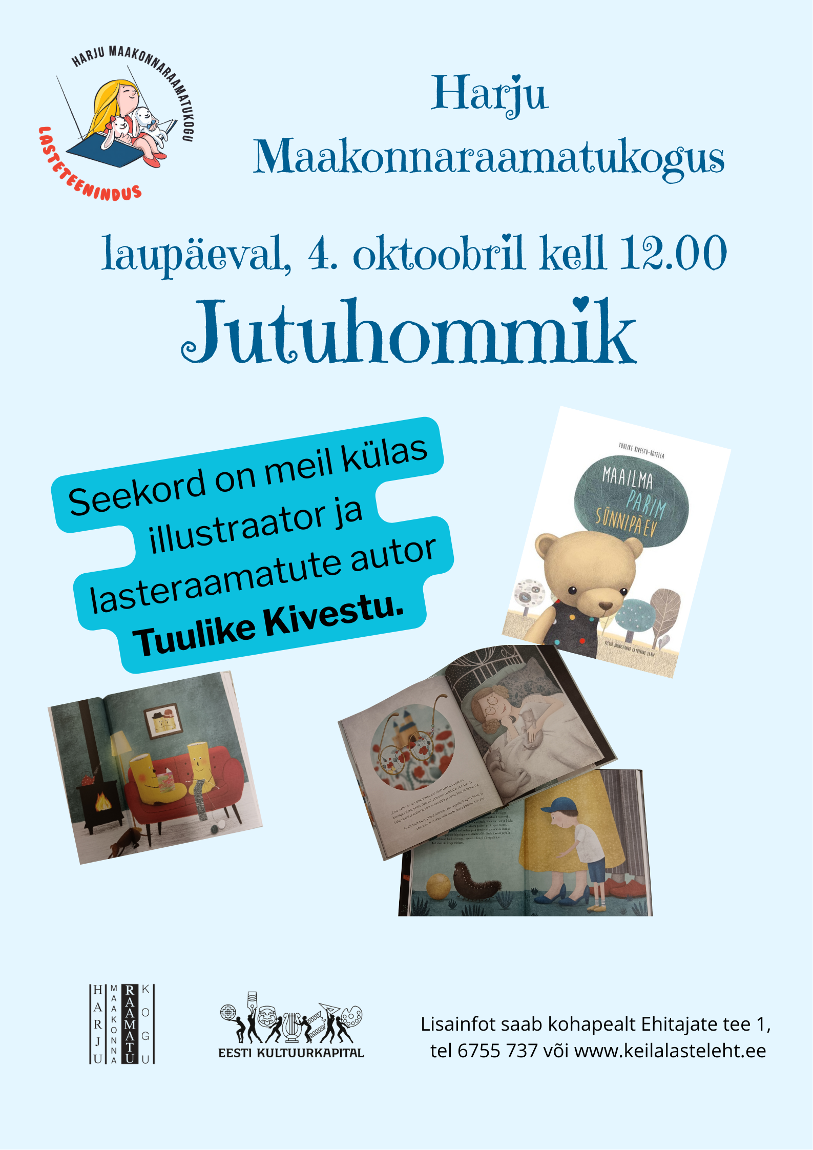 Alustame uue hooaja Jutuhommikutega. Oodatud on lapsed koos oma vanematega. Esimesele Jutuhommikule tuleb külla illustraator ja lasteraamatute autor Tuulike Kivestu, kes loeb ette oma peagi ilmuvast lasteraamatust ning joonistab koos lastega.