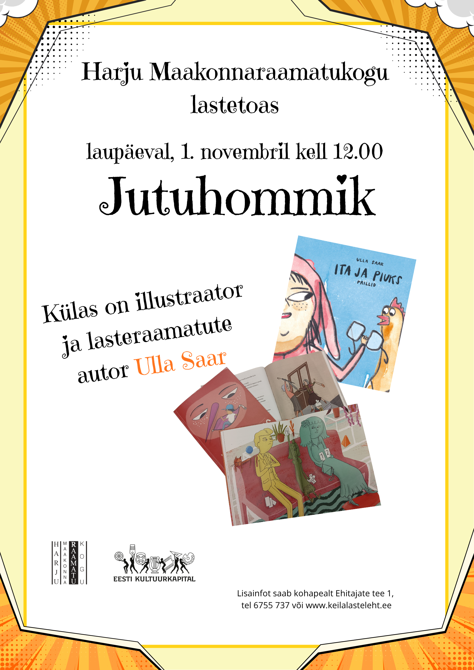 Ootame lapsi koos vanematega meie raamatukogu Jutuhommikutele. Seekord on meil külas illustraator ja lasteraamatute autor Ulla Saar. Ulla tutvustab oma uusimaid raamatuid, räägib illustraatori tööst ja kindlasti loeb ka midagi ette.
