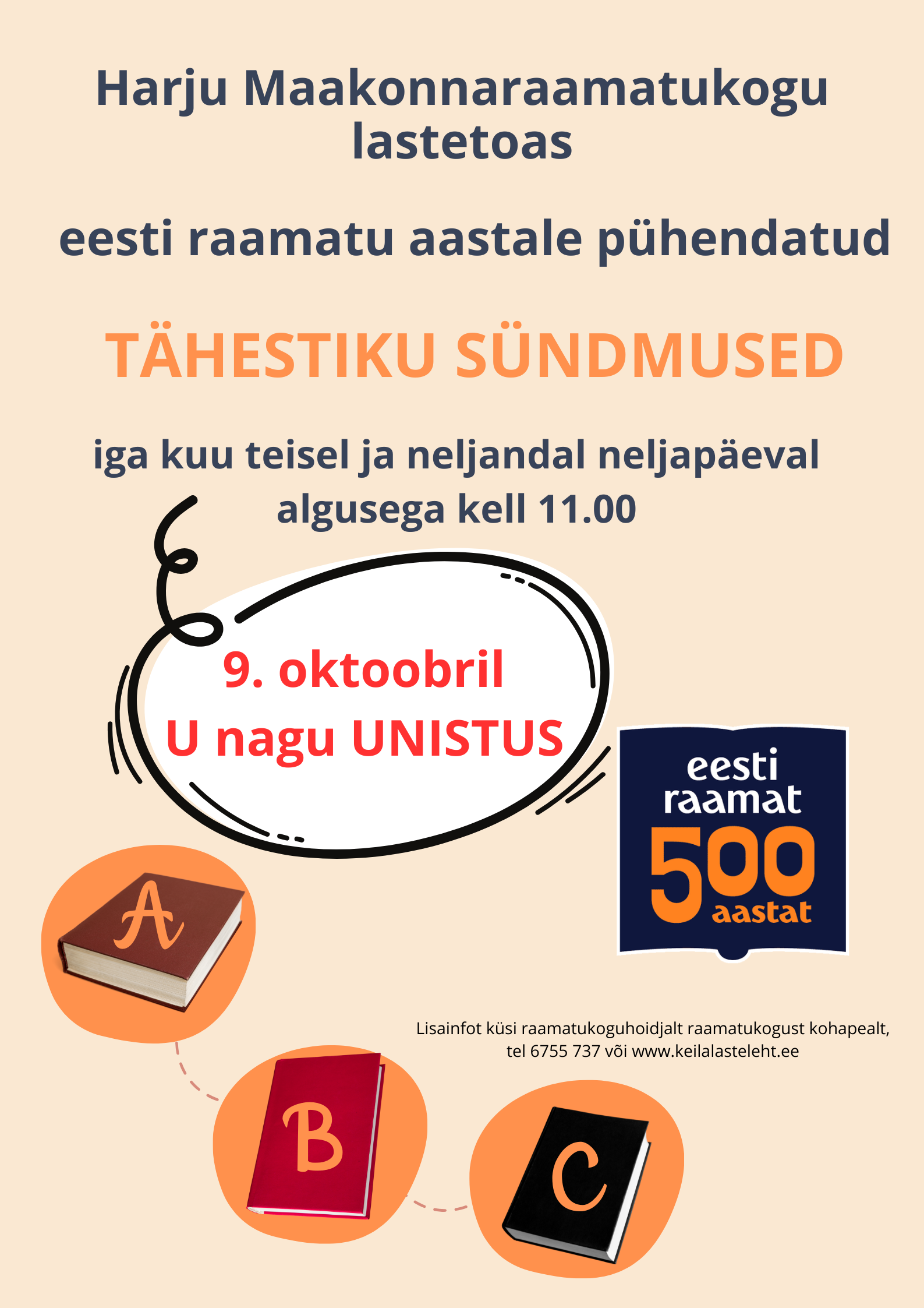 2025. aasta on Eesti Raamatu Aasta ning meie raamatukogu lasteteenindus on ühinenud üle-eestilise üleskutsega teha tähestiku sündmuseid. Meie raamatukogus toimuvad tähestiku sündmused iga kuu teisel ja neljandal neljapäeval kell 11.00. Igal tähestiku sündmusel räägime, loeme või jutustame ühel väljavalitud teemal ning pakume ka lihtsamat käelist tegevust.