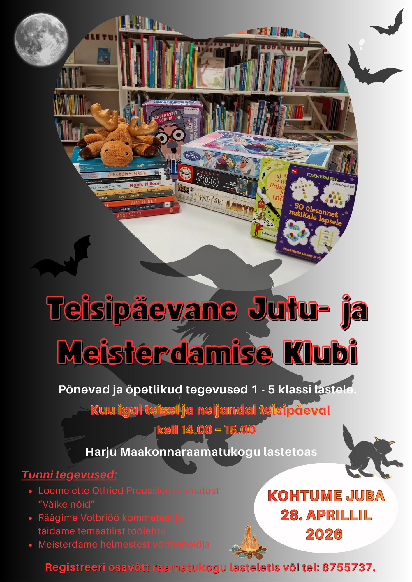Iga kuu teisel ja neljandal teisipäeval kell 14.00-15.00 ootame 1.-5. klassi lapsi raamatukogu lastetuppa, kus saame koos aega veeta. Plaanis on erinevad teematunnid, arutelud, ettelugemised, meisterdamised ja muud ülesanded. Registreeri oma osalemine raamatukogu lasteletis või telefonil 675 5737.